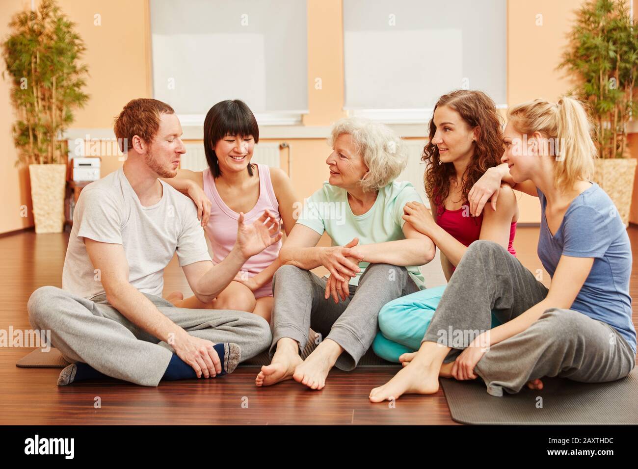Friends Talk To Each Other As A Happy Group In The Fitness Center Stock Photo Alamy