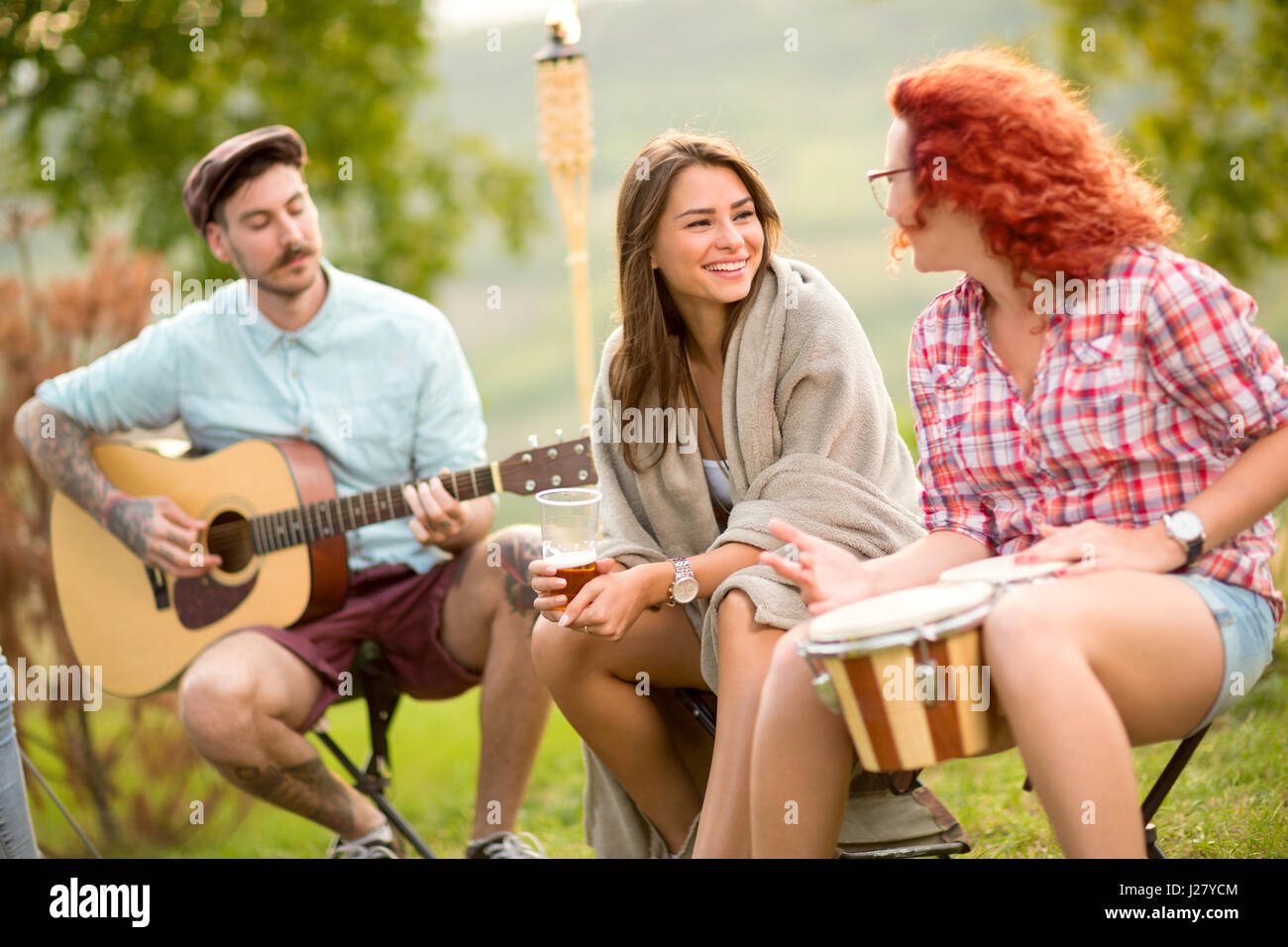 Young Friends Talk And Playing Music Instruments In Nature Stock Photo Alamy
