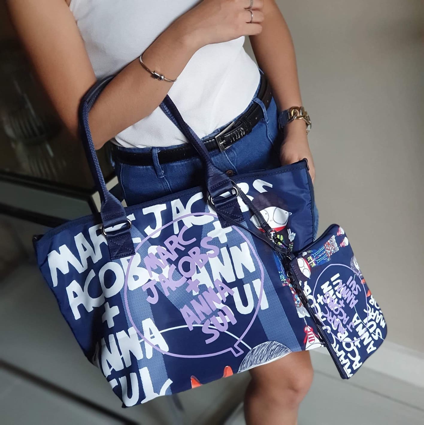 Printed Tote Bag With Pouch By M A R C J A C O B S X Anna Sui Large Logo Navy Blue Lazada Ph